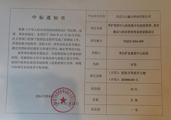枣庄矿业集团中心医院中标通知书